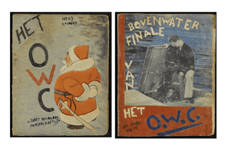 Image: [Left] St. Nicholas in wartime. © Charities Aid Foundation America. [Right] Two men exiting the hatch of what appears to be a boat. The final issue: liberated and “above water.” © Charities Aid Foundation America