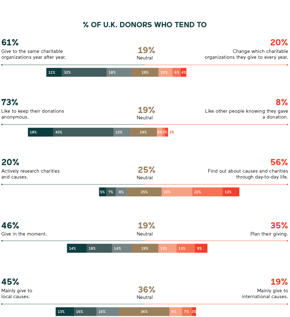 - They prefer to stay anonymous: A majority of donors (69% in the U.K. and 62% in the U.S.) prefer their charitable gifts to remain anonymous. However, some U.S. donors are more comfortable with public recognition; for example, 33% say they do not mind being acknowledged, compared to just 8% of British donors.