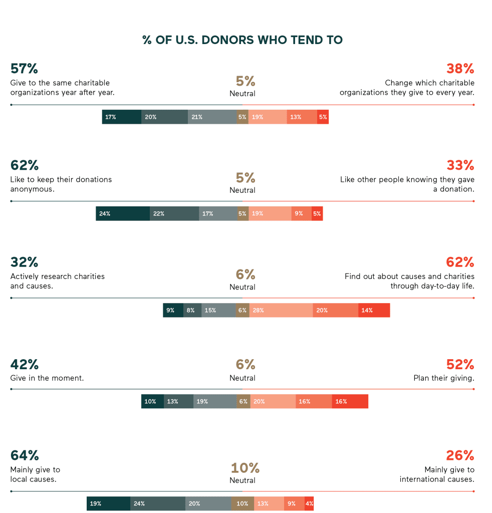 - They discover causes organically: Instead of actively researching charities, 62% of American donors and 56% of British donors say they frequently discover charitable causes during their day-to-day activities, such as through conversations, events, or online.